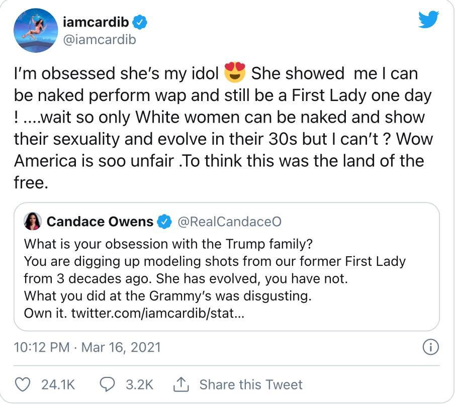 Eppure ai conservatori americani non è andata proprio giù. Candace Owens, presentatrice televisiva afroamericana, ha condotto ieri uno speciale su Fox News mettendo in risalto il testo di WAP e l’intento del brano. La cosa ha fatto infuriare i conservatori in studio e così, Cardi B, ha deciso di replicare su Twitter alle critiche di Candace spiegando il perché di un’esibizione così selvaggia.. e lo fa tirando in ballo la sua ispirazione.