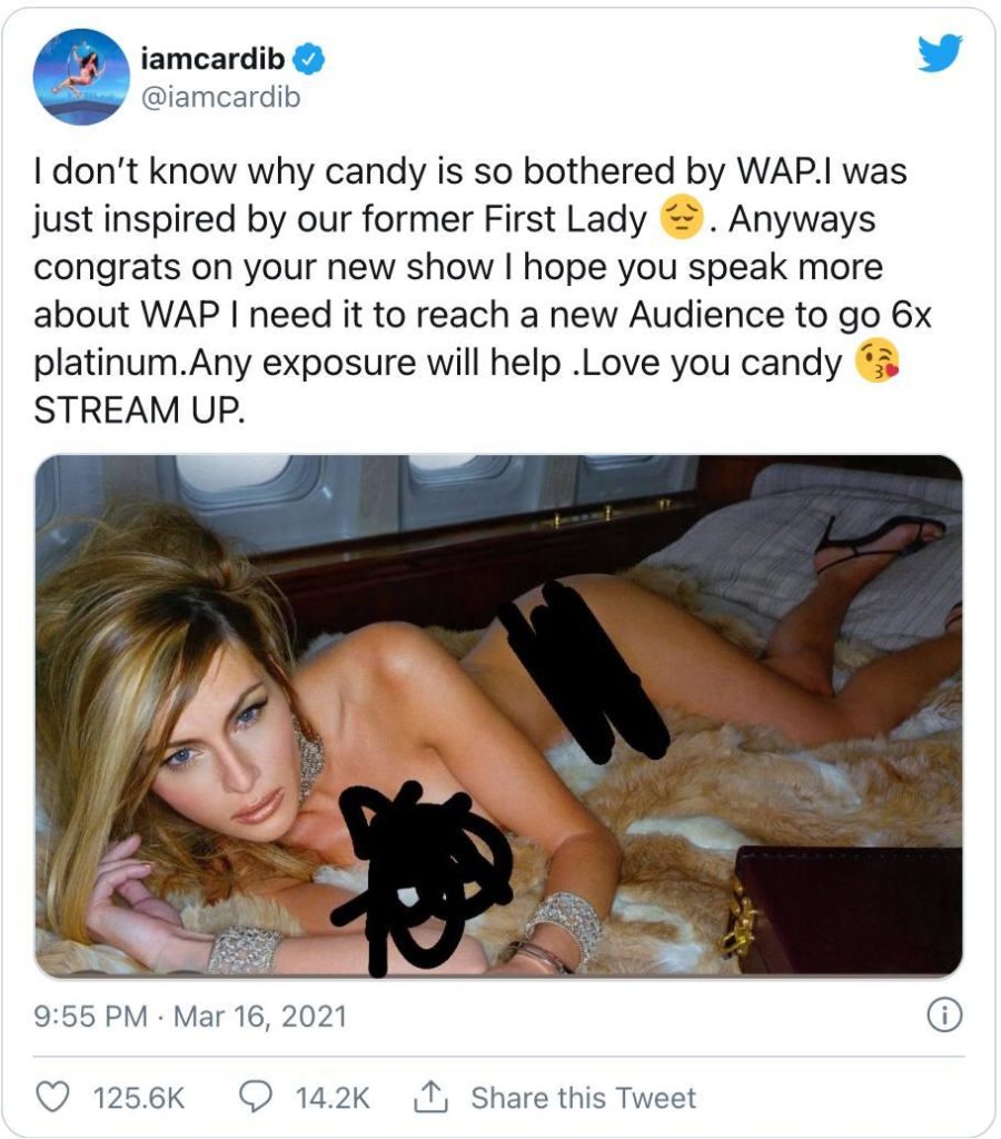 “Non so perché Candy sia così infastidita da WAP”, ha twittato Cardi accanto alla foto di Melania Trump nuda. “Sono solo stata ispirata dalla nostra ex First Lady”.