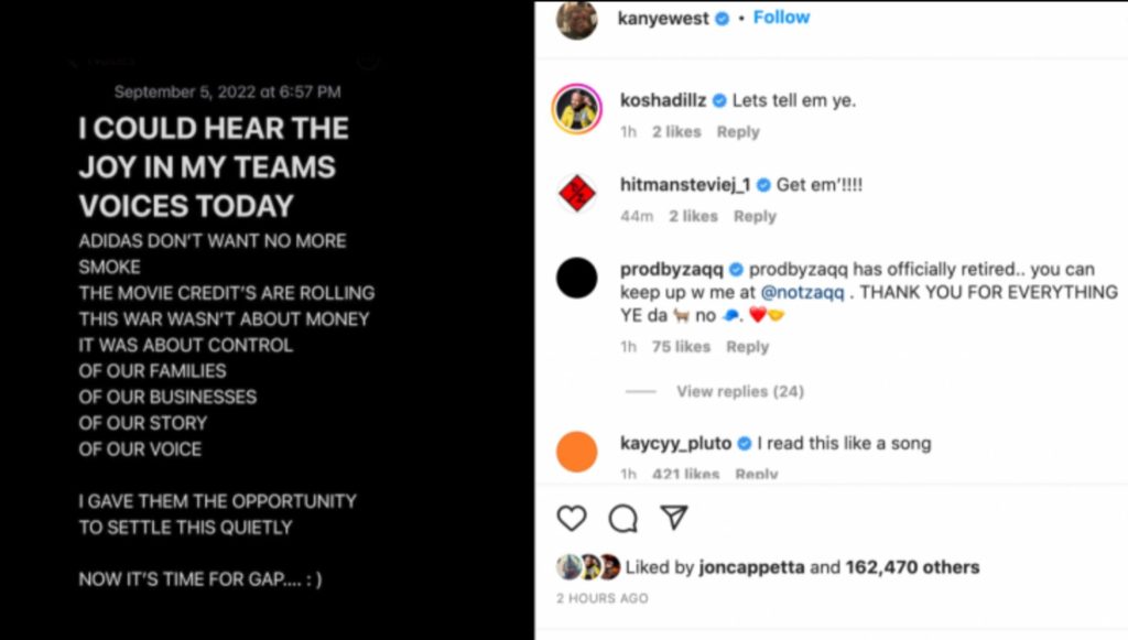 Kanye West aveva criticato aspramente il rivenditore GAP, sostenendo che lo stava lasciando fuori dalle riunioni e che ne frattempo stava copiando i suoi modelli della collezione Yeezy Gap Engineered by Balenciaga. “Gap ha tenuto una riunione su di me senza di me?” si è chiesto in una didascalia pubblicata su Instagram ad agosto.