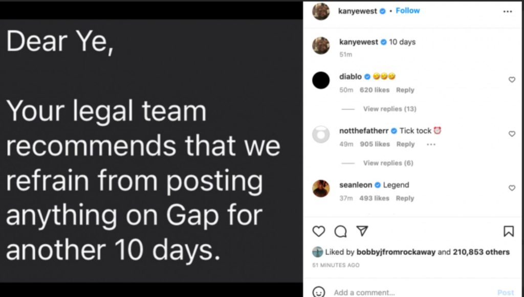 In un post successivo, Kanye West, ha condiviso una nota scritta in maiuscolo in cui si legge: ”Caro Ye, il tuo team legale raccomanda di astenersi dal pubblicare qualsiasi cosa su Gap per altri 10 giorni. ” Il rapper nella didascalia ha aggiunto : ”10 giorni”.