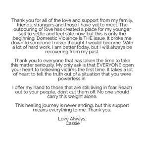 L’ha reso noto lei stessa con un post su Instagram pubblicato stamattina, in cui ringrazia tutti coloro che le sono stati vicini, fisicamente o metaforicamente, dopo il leak: “Thank you for all the love and support from my family, friends, strangers and those I have yet to meet”, ha scritto, “The outpouring of love has created a place for my younger self to settle and feel safe now, but this is only the beginning. Domestic violence is THE issue. It broke me down to someone I never thought I would become. With a lot of hard work, I am better today, but I will always be recovering from my past”.